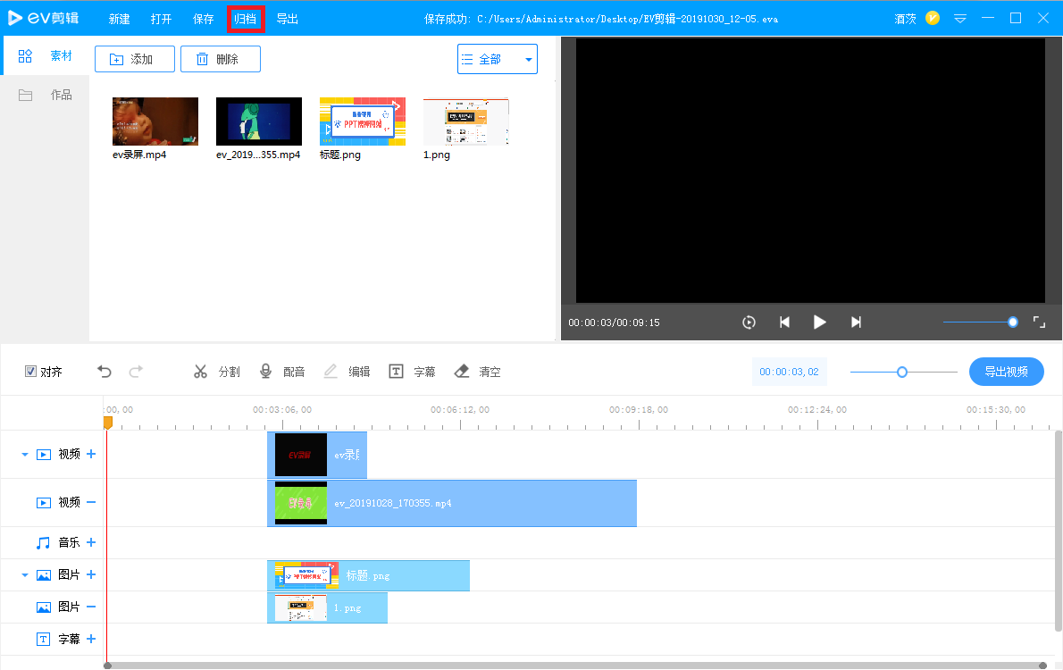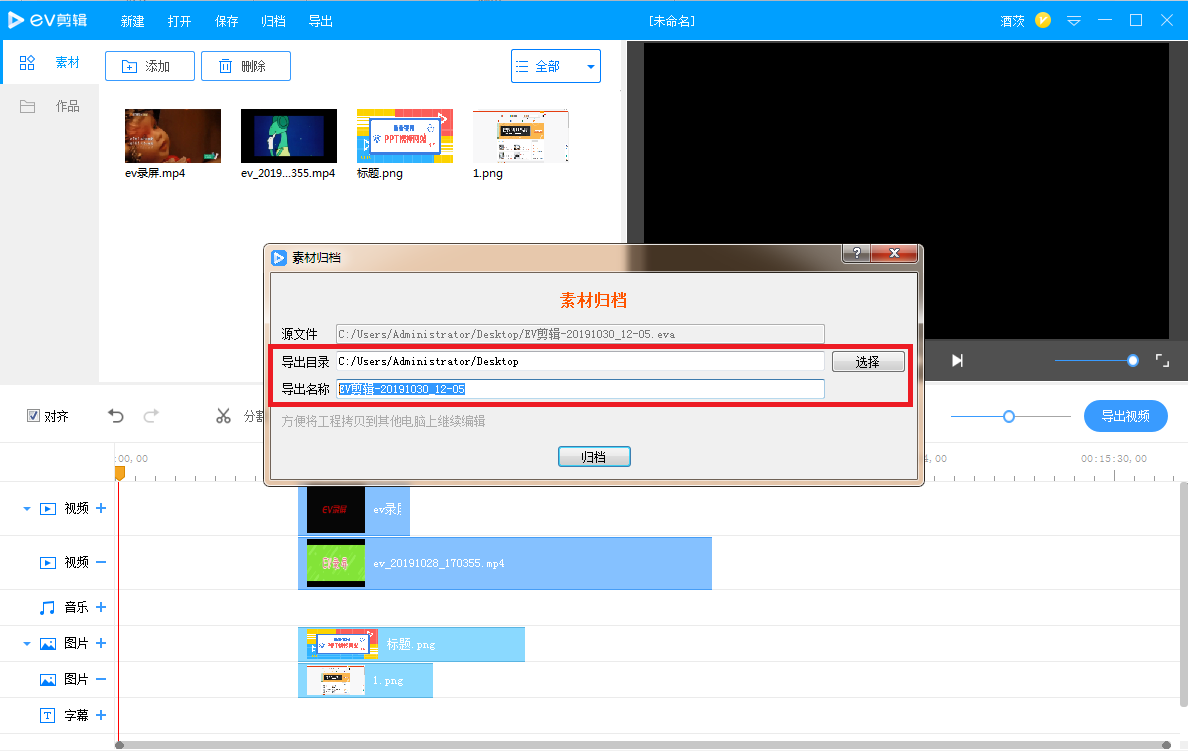 视频剪辑告一段落,大家务必记住一件事,就是归档。如图,点击上方【归档】,出现对话框,设置素材文件导出目录、导出名称,【resourse】是我们剪辑添加的素材,另外一个是EV剪辑的文件,如果需要继续修改,可以打开继续编辑。