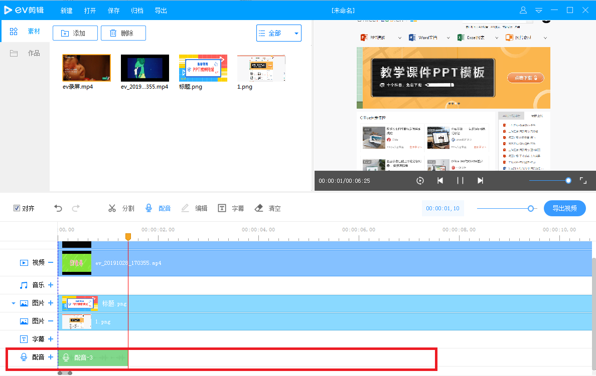 如果你想对视频进行配音,点击工具栏中的【配音】按钮,可以看到下方的配音轨道在前进,说明已经开始收录声音,停止录音,还是点击【配音】按钮。