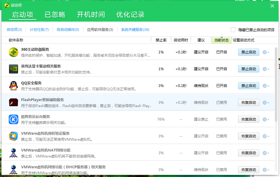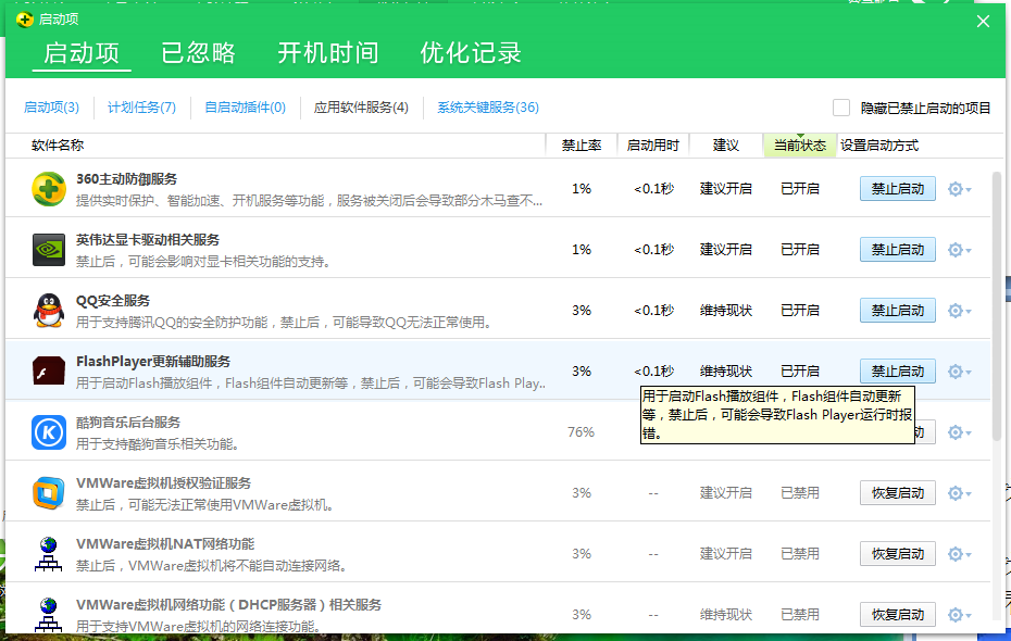5、如“Flash Player更新辅助服务”显示为“已禁用”,点击其对应的【恢复开启】即可。