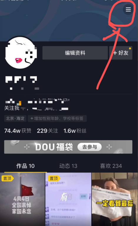 在手机中打开抖音APP,进入首页,点击右下角的【我】,查看个人中心,点击右上角的菜单,