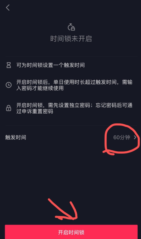 点击【时间锁】,如图,设置【触发时间】,如果单日使用时长超过触发时间,必须输入密码才能继续刷抖音,否则就会关闭抖音,
