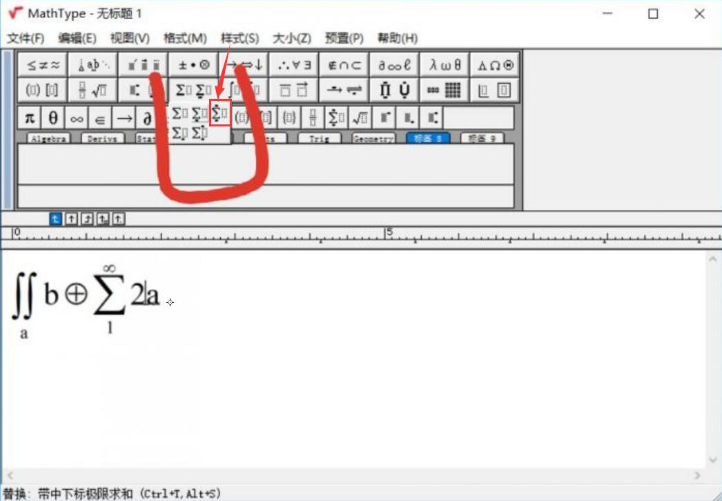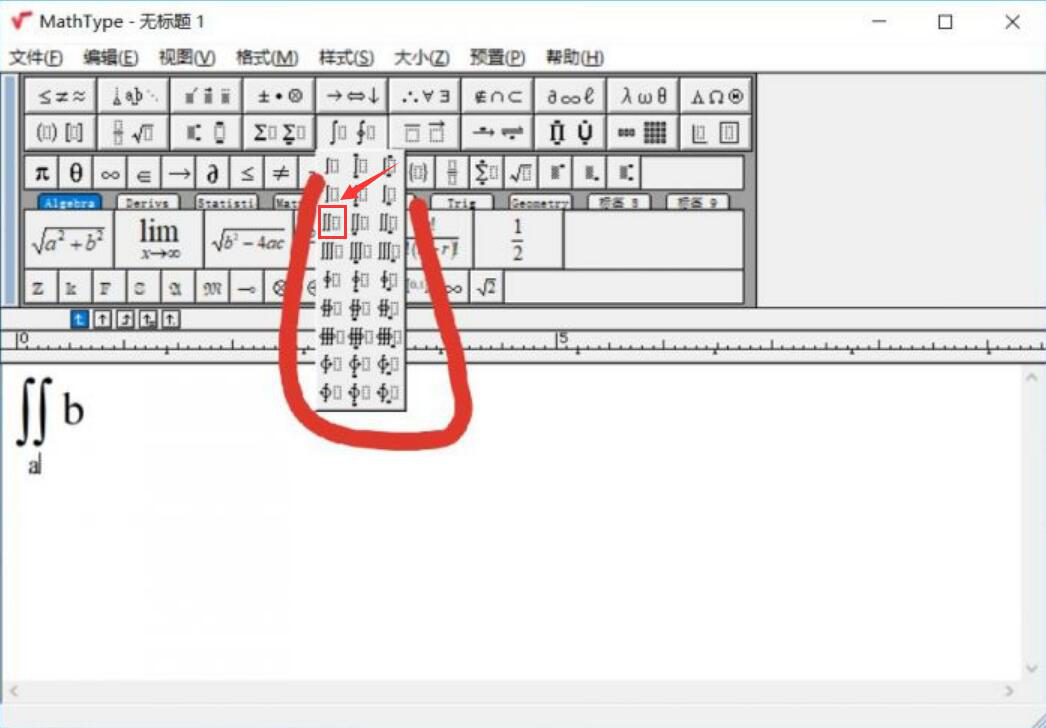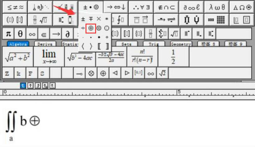 2、然后,在公式编辑器的编辑区域,确定符号插入的位置,再从工具栏中调用自己所需的微积分符号。