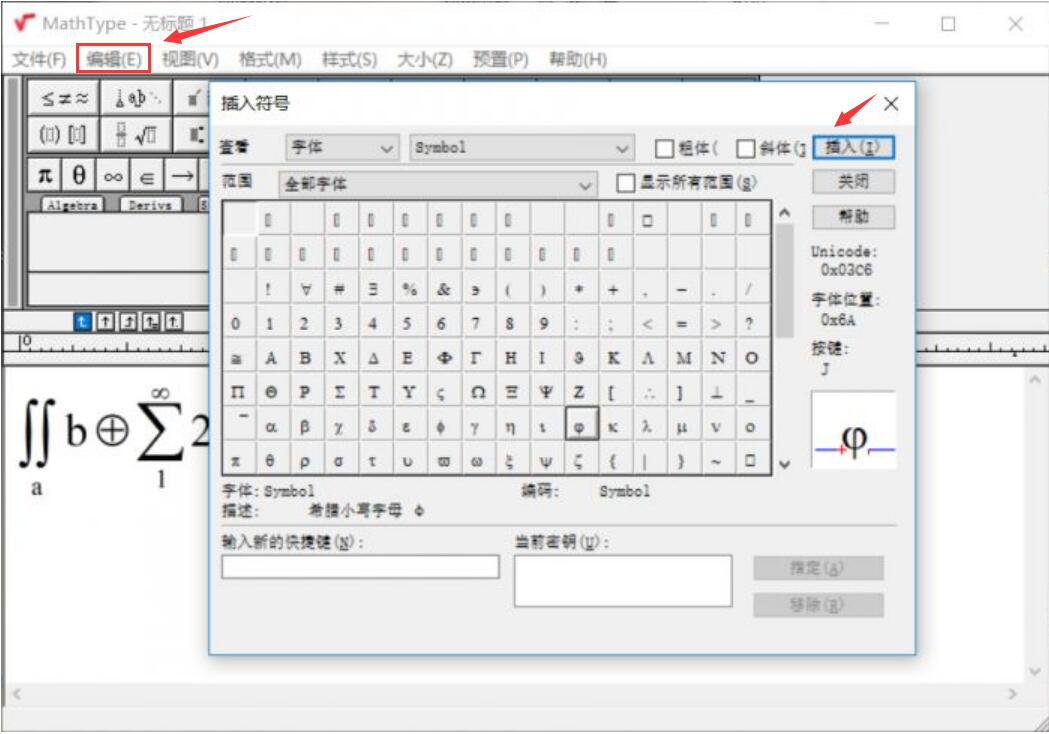 5、最后,用户想论文中的组合公式更丰富的话,还可以点击公式编辑菜单栏中的“编辑”,弹出的“插入符号”窗口中,用户点选适合自己论文组合公式想要的符号,点击“插入”按钮即可打出了。