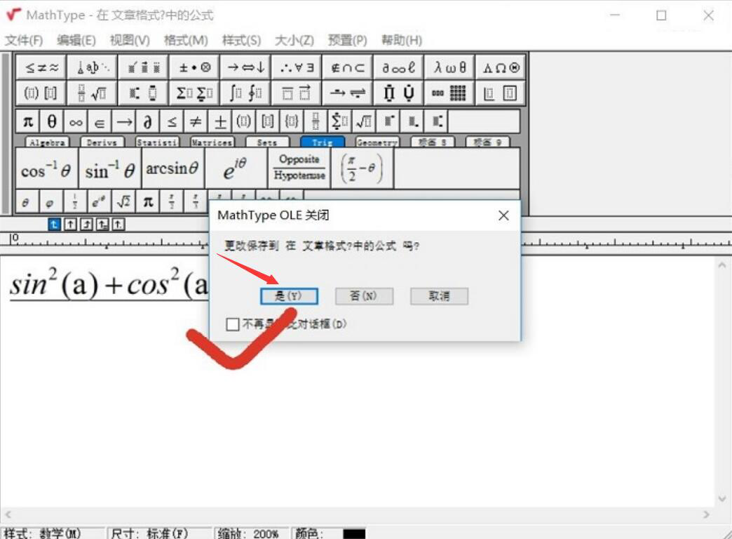 4、最后,在word公式编辑器中插入数学公式完成后,将公式编辑框关闭。它便会弹出如下图的提示小窗口。用户勾选“不再显示此对话框”并点击“是”的按钮。这样一来,在word里编辑插入数学公式就成功了。