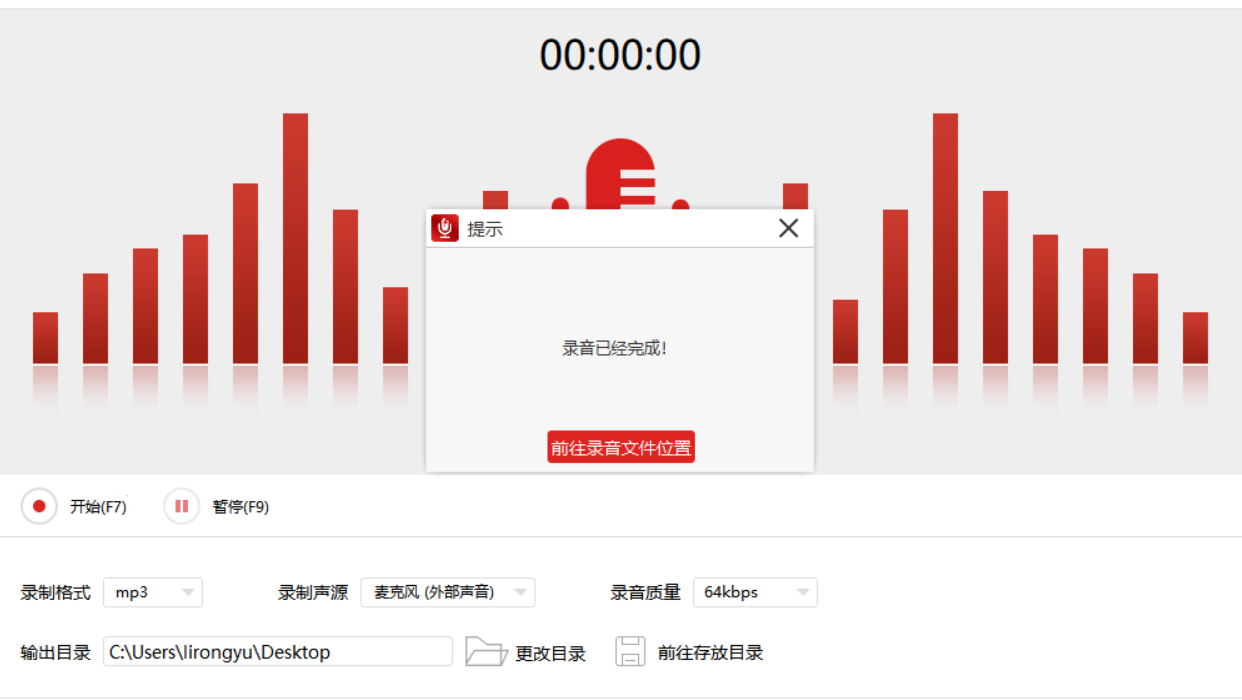 点击【更改目录】,出现弹窗,选择录音文件保存位置,设置完成,点击【开始】按钮,即可进行录音,录制结束,点击停止,这时会出现“录音完成”的提示,