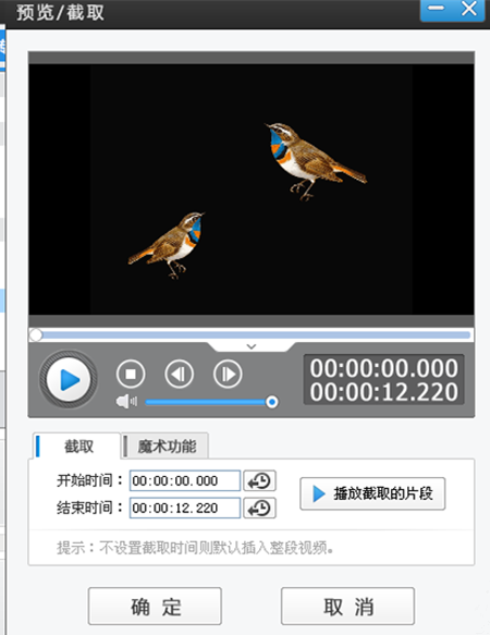 弹出【预览/截取】窗口,如图,你可以裁剪视频,点击确定,即默认使用原视频,