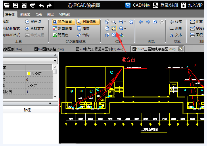 下载安装迅捷CAD编辑器,打开软件,进入界面,导入需要转换的CAD图纸,如图,在上方点击【查看器】,选择【适合窗口】图标,将CAD图纸进行放大,