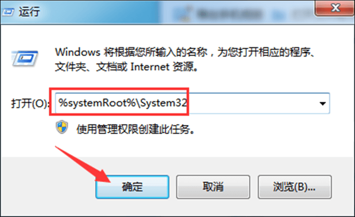 1、点按快捷键【Windows+R】,打开运行对话框,然后输入命令%systemRoot%\\System32,点击确定,