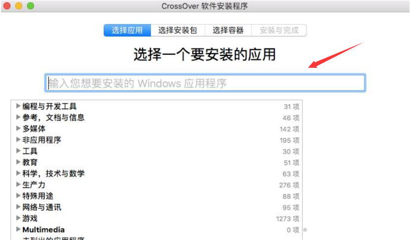 6、最后,进入crossover软件安装程序的界面。用户可以通过文本搜索框输入自己想要安装的Windows应用程序,也可以通过分类来查找,找到后,按照安装的向导便可成功安装Windows应用程序了。