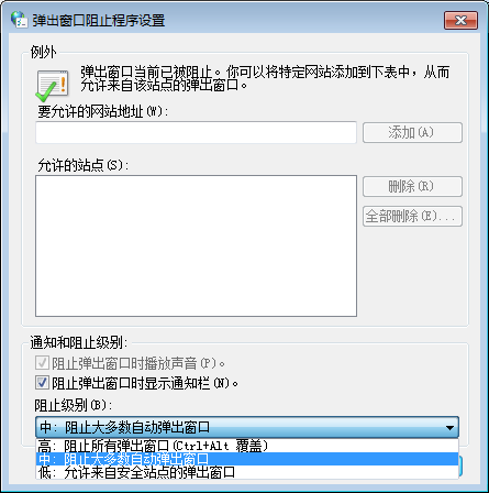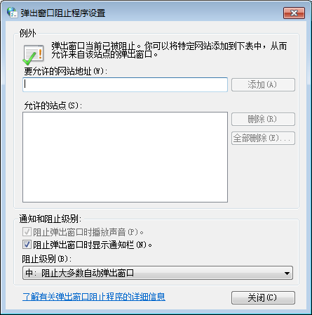 7、调节阻止级别,一般调整为“中:阻止大多数自动弹出窗口”。设置完成后点击【关闭】。
