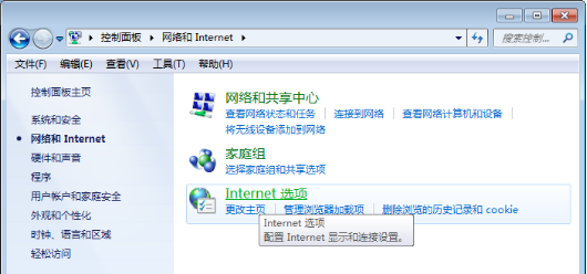 4、弹出“网络和internet”窗口,点击【internet选项】。
