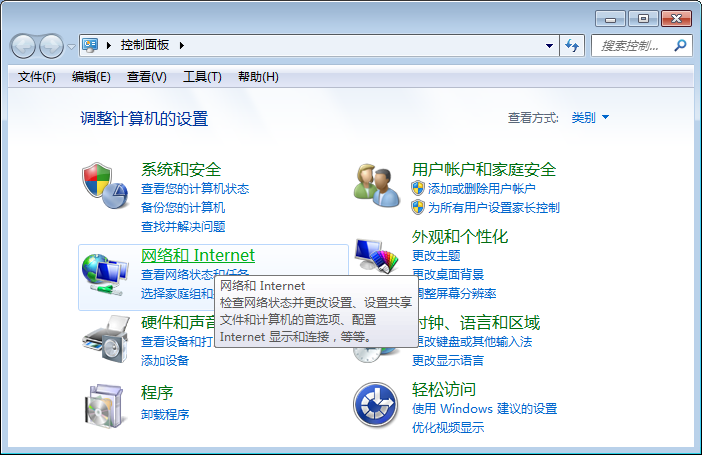 3、弹出“控制面板”窗口,点击【网络和internet】选项。