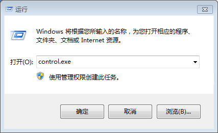 2、弹出“运行”窗口,在文本框内输入“control.exe”,然后点击【确定】。
