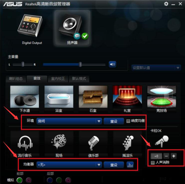 3、完成喇叭组态的调整后,接下来,在Realtek高清晰音频管理器界面,切换至“音效”的调整界面。它主要是可以调整音效的环境,重设均衡器。一般来说,不用勾选“人声消除”,而卡拉OK的数值一般调整为0。