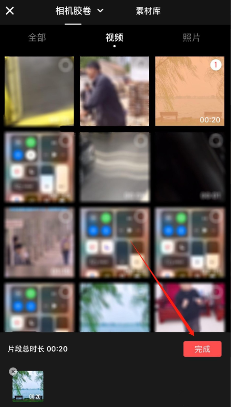 打开快影APP,进入首页,点击底部的【+】,在相册中选择视频文件,点击【完成】,