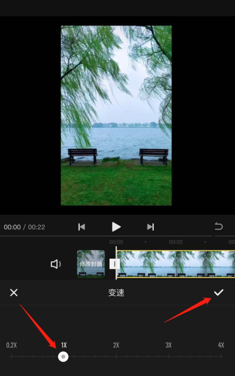 点击滑动白色滑块,向左滑动代表慢速播放,向右滑动代表快速播放,设置完成,点击右侧的对勾,
