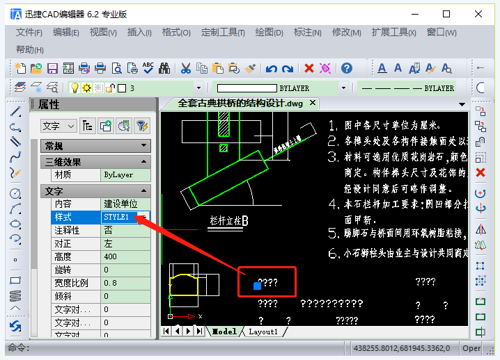 如图,CAD图纸中有一些文字不能显示,变成了问号,点击问号,鼠标右击,调出【属性】栏,找到【文字】——【样式】属性,即可看到当前显示成问号的文字的文字样式为STYLE1,
