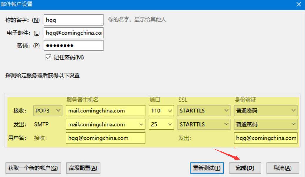8、当mozilla thunderbird雷鸟客户端的设置完成后,点击“完成”即可。