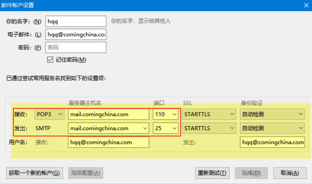 4、接下来,在邮件账户设置中,用户需要将“POP”和“SMTP”这两个服务器换成内网的IP,端口分别设置为110和25。