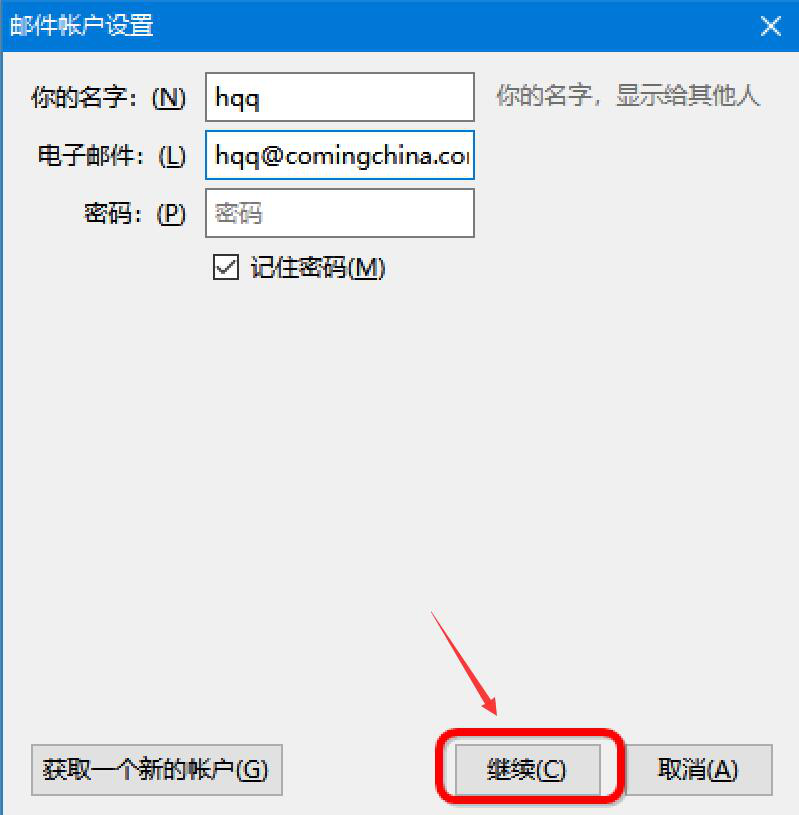 2、然后,在mozilla thunderbird雷鸟客户端的邮件账户设置窗口中,正确输入你的名字、电子邮件、密码,点击“继续”。