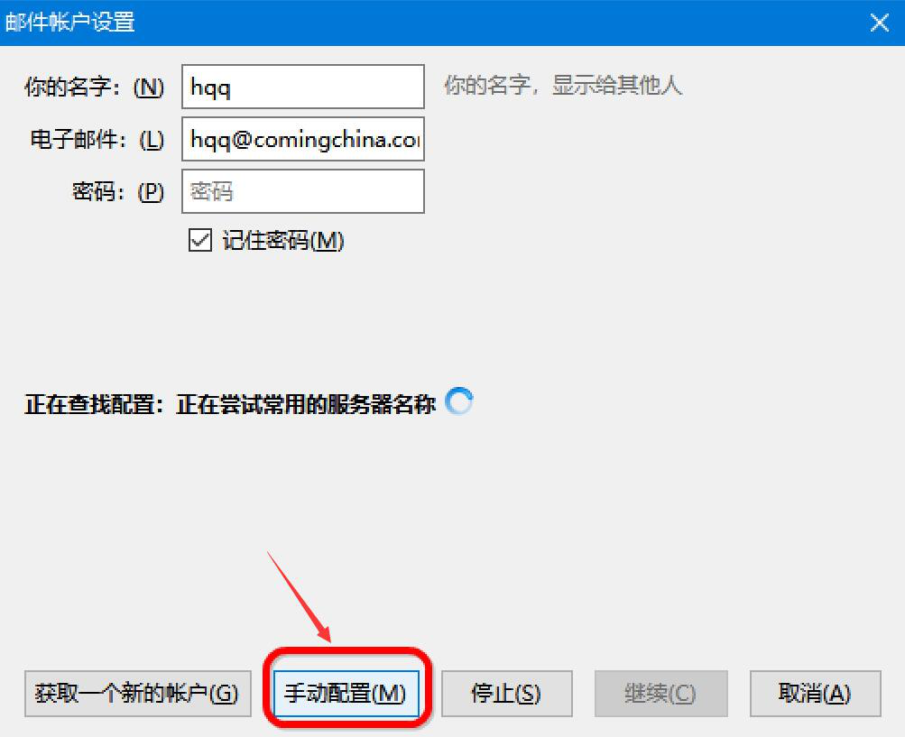 3、此时,进入查找配置的状态。如果用户使用的是内网,那就点击“手动配置”,从而继续mozilla thunderbird雷鸟客户端的设置。