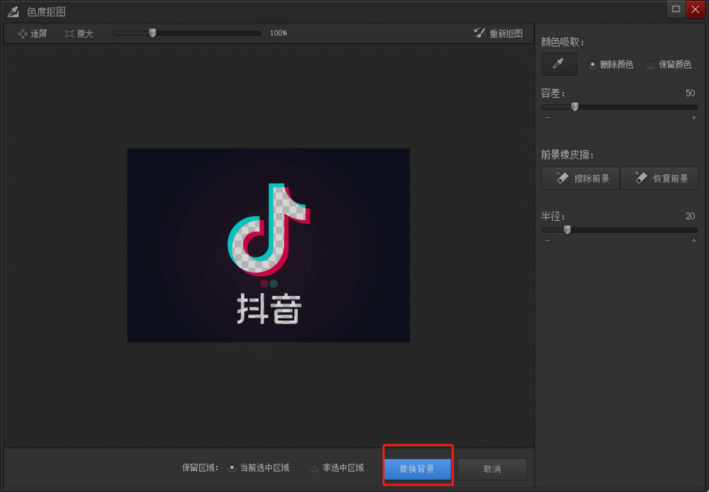 小编选择的是【色度抠图】,如图,这里选取了中间白色区域,软件会自动抠图,然后点击【替换背景】,