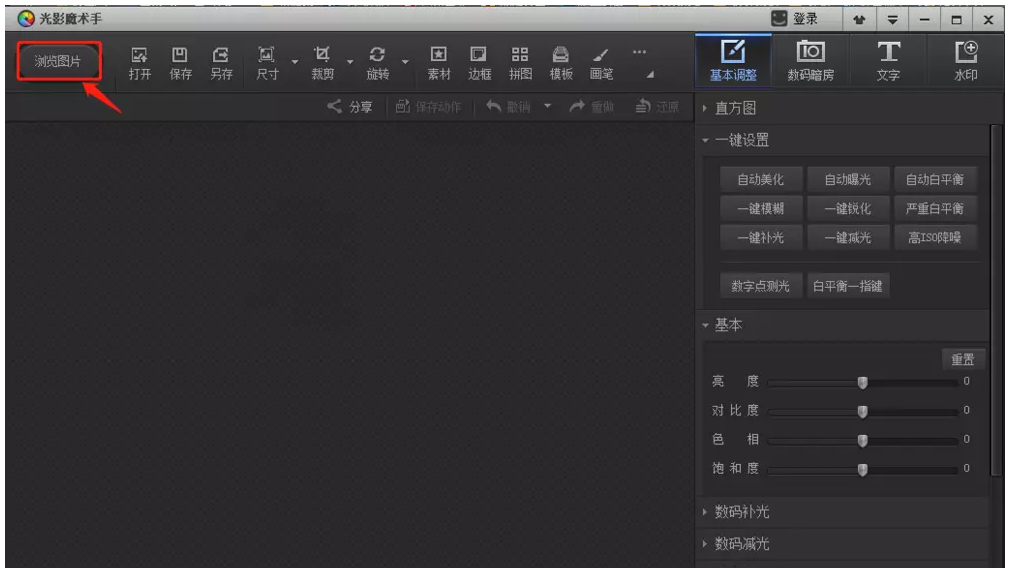 打开光影魔术手,进入软件界面,如图,点击【浏览图片】,导入一张图片素材,