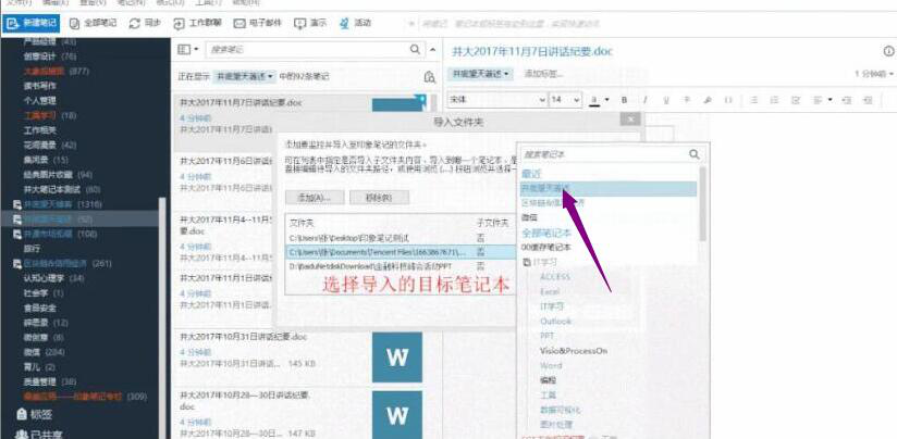 3、因为用户要把电脑中的文件批量导入印象笔记,所以,双击窗口的笔记本,弹出的笔记本搜索窗中,用户选择需要导入的目标笔记本。