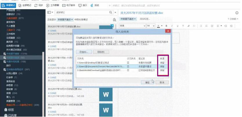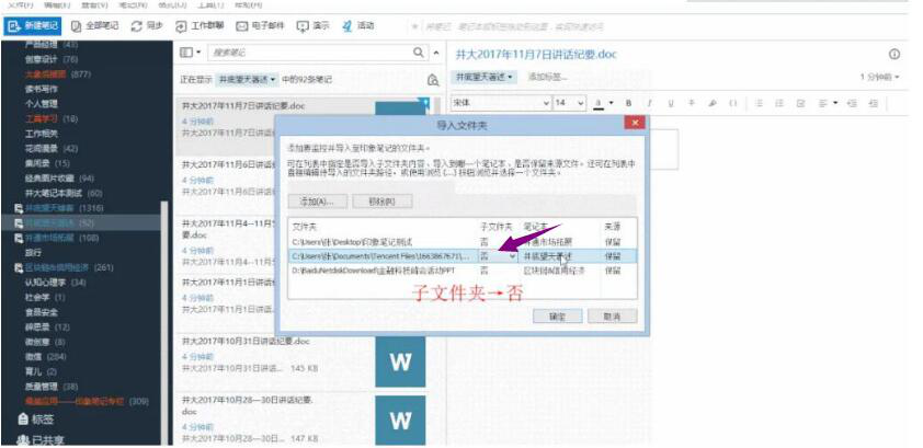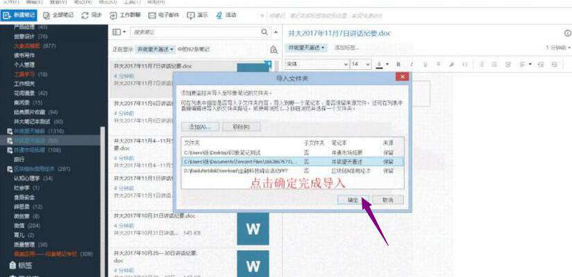 5、当子文件夹、笔记本、来源这三项内容都设置好后,点击“确定”按钮。印象笔记便开始批量导入电脑中的文件。