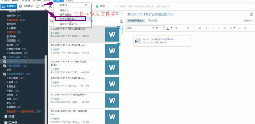 1、首先,用户需要登录印象笔记。在印象笔记的操作界面中,点击菜单栏“工具”的子菜单中的“导入文件夹”。