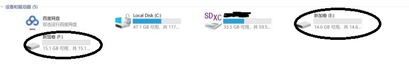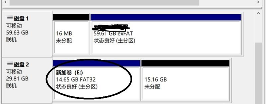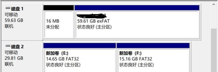13、第二个分区划分完成,你可以看到“新加卷E”和“新加卷F”这两个分区,说明已经将U盘划分为2个分区,