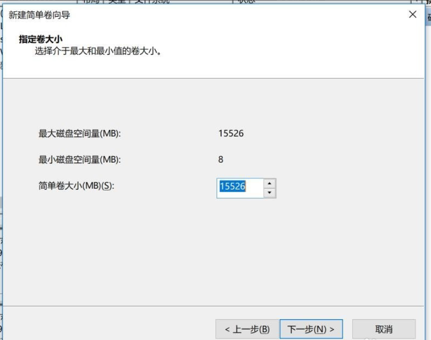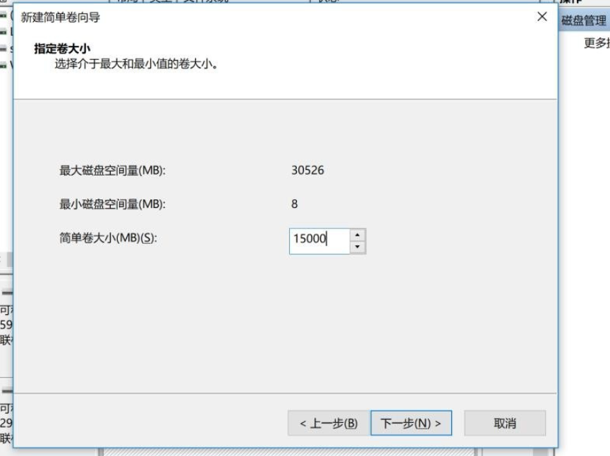 8、如图,磁盘空间量为30526M,设置简单卷大小,这里输入15000M(根据自己需要选择),进行下一步,