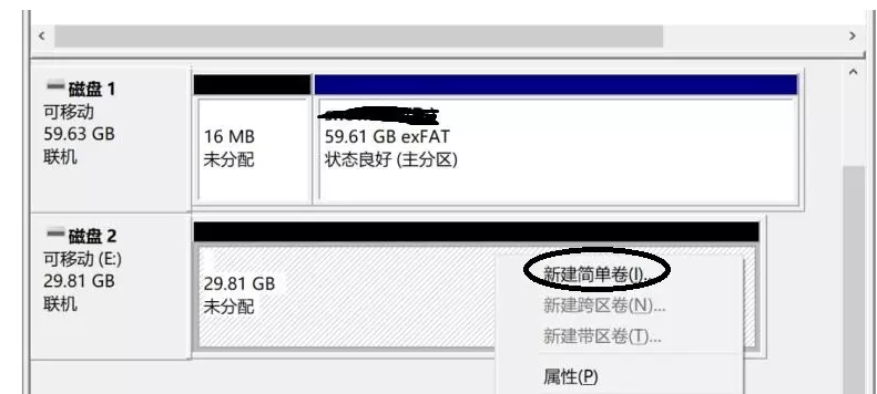 6、现在开始进行磁盘分区的创建,选中磁盘2,鼠标右击,点击【新建简单卷】,