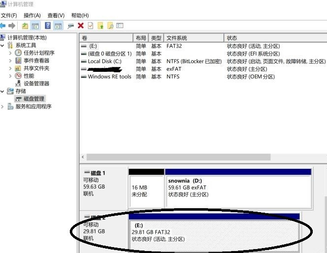 2、鼠标右击【此电脑】,弹出菜单,选择【管理】,进入计算机管理界面,如图,点击【磁盘管理】,找到U盘(可以根据U盘大小和卷标进行判断),图中即为我的32GU盘,