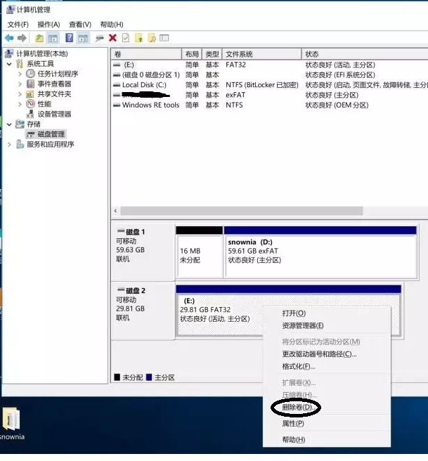 3、U盘当前拥有一个分区,使用鼠标右击卷标为E的磁盘,选择【删除卷】,分区之前一定进行数据备份,