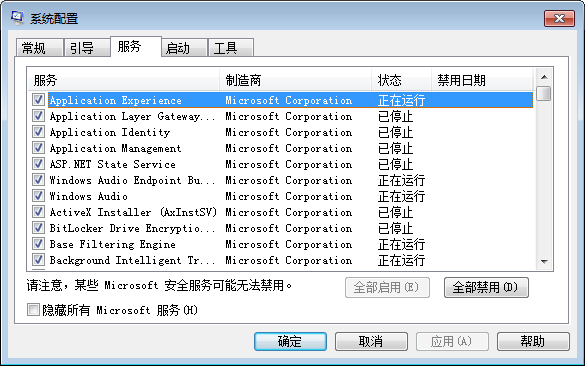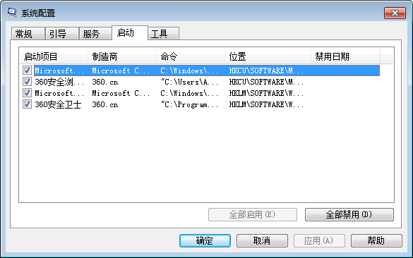 4、如果软件闪退没有获得改善,再打开系统配置窗口。选择上方【启动】,然后点击【全部禁用】,最后点击【确定】。