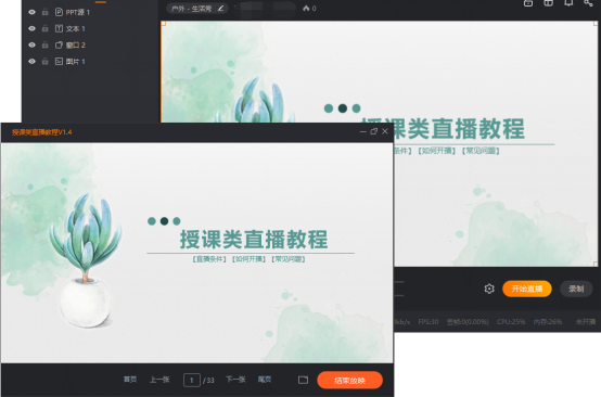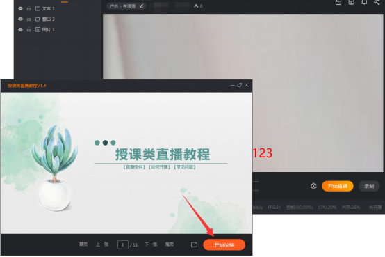注意:不要在 “授课类直播教程”窗口上叠加其他窗口,否则其他窗口会被抓屏播放到直播公屏上。