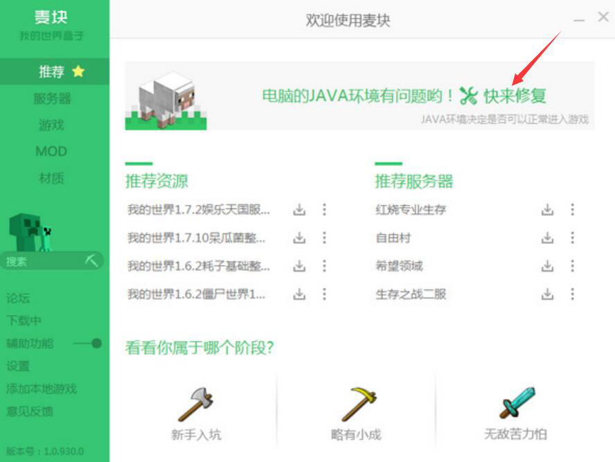 3、如果电脑中并未安装JAVA。那么麦块我的世界盒子便会弹出如下图的提示,用户点击“快来修复”便可自动下载安装JAVA环境。