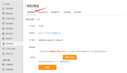 4、完成银行卡绑定之后,选择【佣金提现】选项。在“提取金额”后的文本框内输入提取金额(提现金额为整数且不得低于100元),接着点击【获取手机验证码】,然后将绑定手机收到的验证码输入对应文本框,点击【提现】。平台账号上的款项就会提取到银行卡。