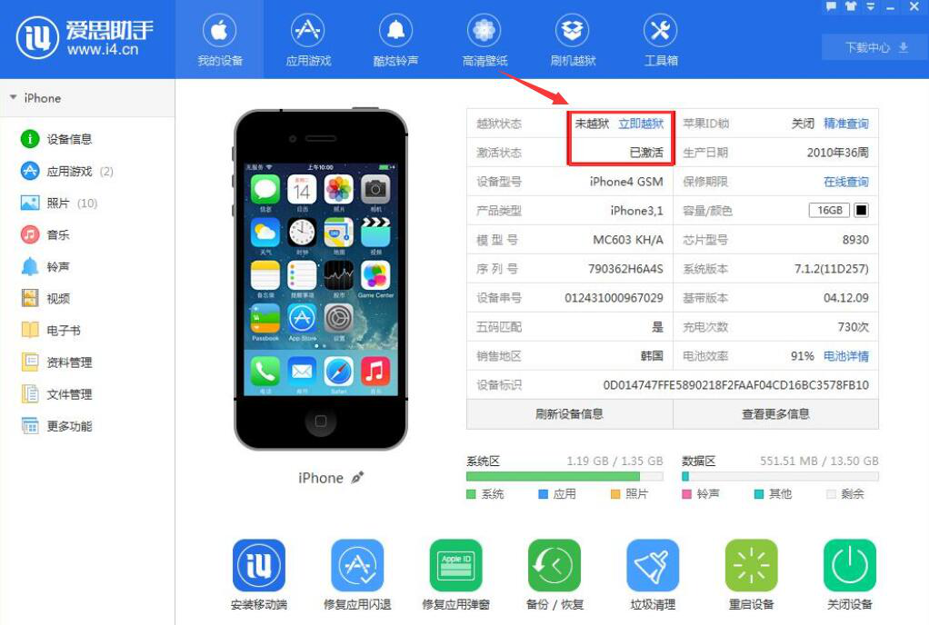 5、最后,用户打开电脑端的爱思助手,将苹果手机连接电脑,爱思助手识别苹果手机后,会发现它的越狱状态是“未越狱”。这说明爱思助手将iOS13越狱手机还原已经成功了。