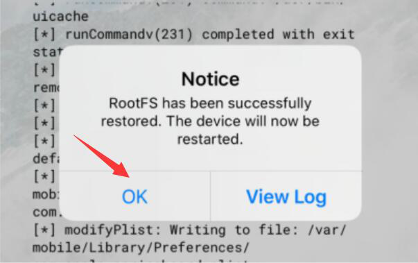 3、此时,unc0ver会自动跳转回操作首页。在弹出来的提示窗口中,点击OK,等待苹果手机系统注销后重启,便可以将之前自己安装的iOS13操作系统全部清除。