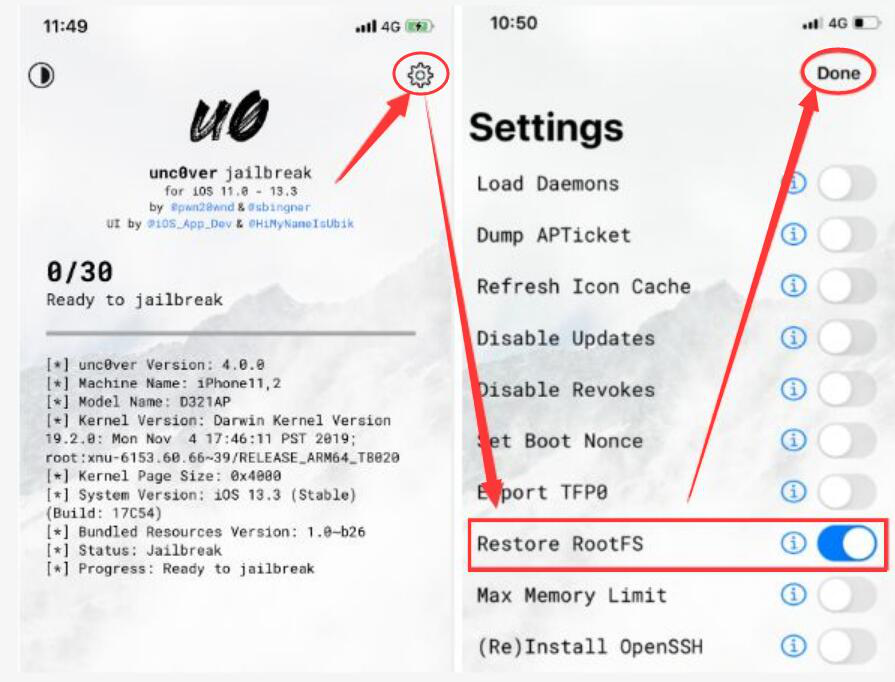 2、然后,点击unc0ver软件右上方的设置图标进入设置页面。在设置页面中,开启“Restroe RootFS”,并将其他内容项全部关闭。再点击设置页右上方的“Done”进行保存。