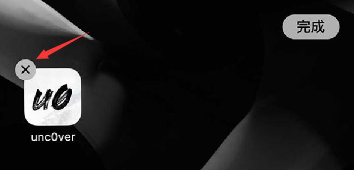 4、当用户将苹果手机重启后,会发现“Cydia”这款软件已经自动消失了,不过越狱工具unc0ver还残留着。因为要将iOS13越狱手机还原,故此,要长按unc0ver图标,点击它那“×”图标将它删掉。