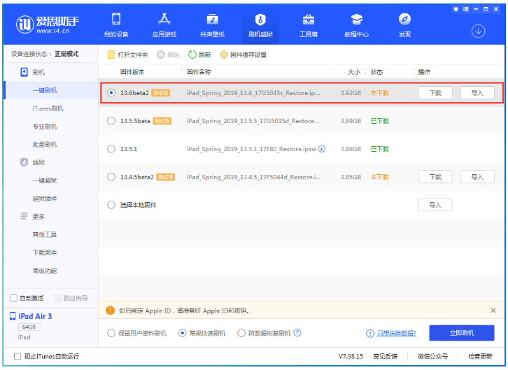 2、在最上方菜单选项中选择【刷机越狱】,然后在左侧选项中点击【一键刷机】,系统自动匹配固件,勾选选择13.6beta2固件,点击右侧对应【下载】,之后爱思助手会自动下载该固件并刷机。