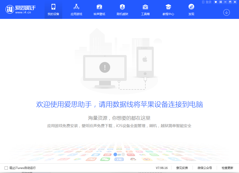 1、电脑端打开爱思助手,用数据线将苹果手机与电脑连接。