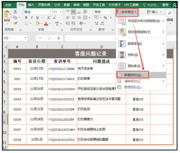 2、在菜单栏中点击【开始】——【样式】——【条件格式】——【新建规则】,