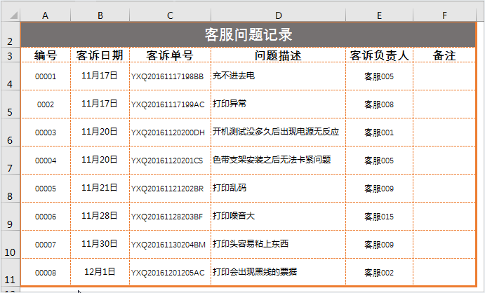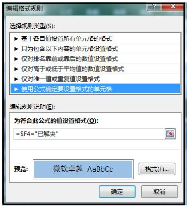 注意,条件格式中的公式可以有多种写法,如果你想在F列单元格输入指定内容、使得单元格所在的列自动标记颜色,比如输入“已解决”,公式为【=$F4=\"已解决\"】,