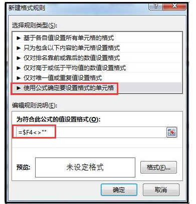3、打开【新建格式规则】对话框,点击【选择规则类型】,选中【使用公式确定要设置格式的单元格】,然后点击【为符合此公式的值设置格式】,输入公式【=$F4】,