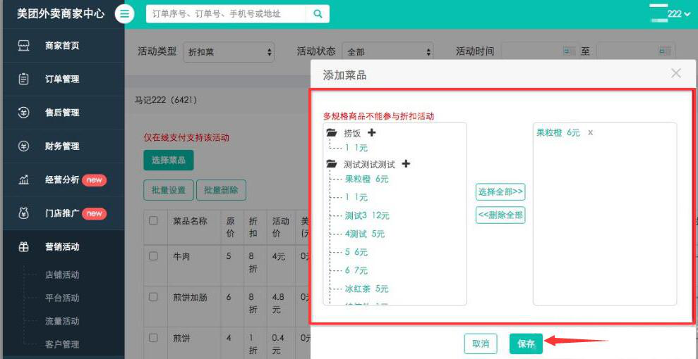 3、在弹出的“添加菜品”的菜单中,美团外卖商家也可以选择全部商品参加超值折扣活动,然后点击“保存”按钮。