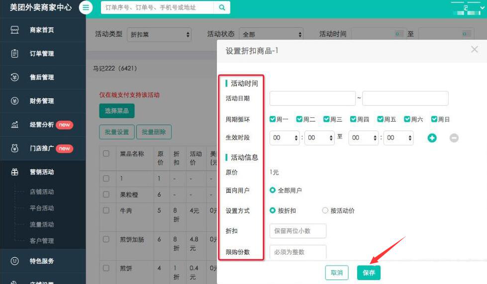 4、选择好活动菜品,点击菜品栏右侧操作的“编辑”功能,便会弹出如下图的设置窗口,美团外卖商家根据自己的活动需要,设置活动时间和活动信息,超值折扣商品的设置完成,点击“保存”按钮。